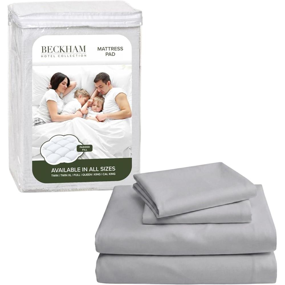 Beckham Hotel Collection California King Size Mattress Pad & Gray Cotton Sheet Set, Deep Pocket, All Season Use